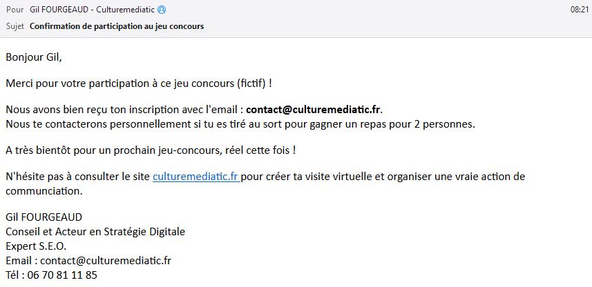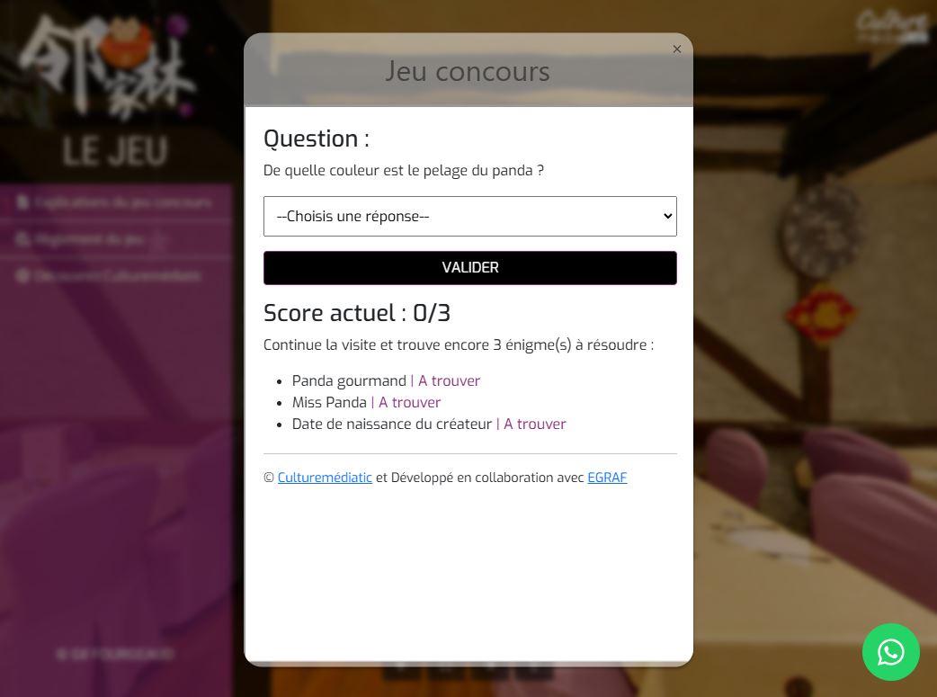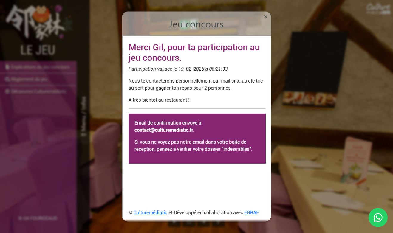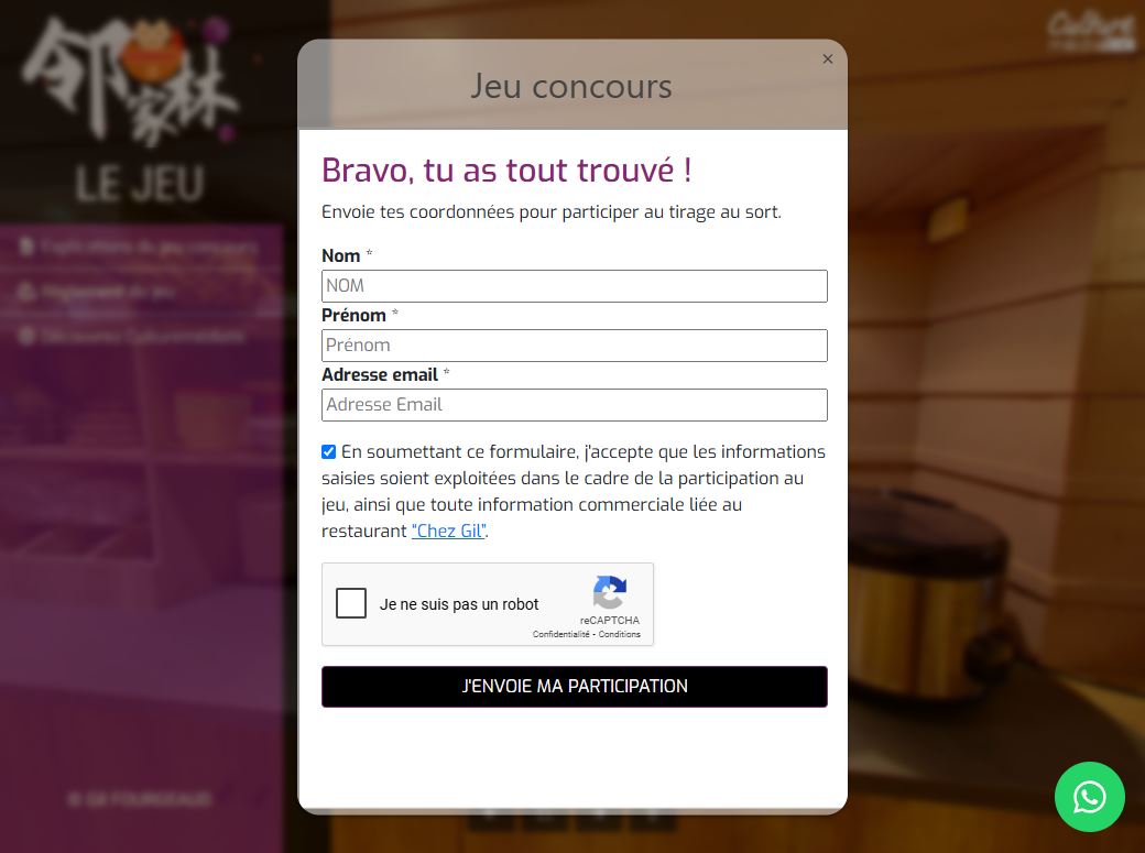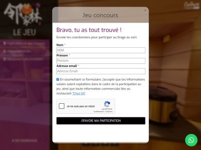 | Etape 3 : Remplir le formulaire de participation Une fois le jeu terminé, un formulaire de participation apparaît pour valider la participation du joueur. |