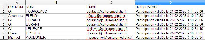 | Etape 4 : Confirmation de l’inscription Récupérez les données de participation dans un format csv que vous pourrez utiliser sur votre logiciel tableur préféré. |