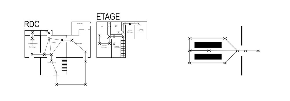 Exemple de disposition des panoramas pour un parcours de visite d’un gîte sur 2 étages et pour un parcours de visite d’une boutique avec rayon central.