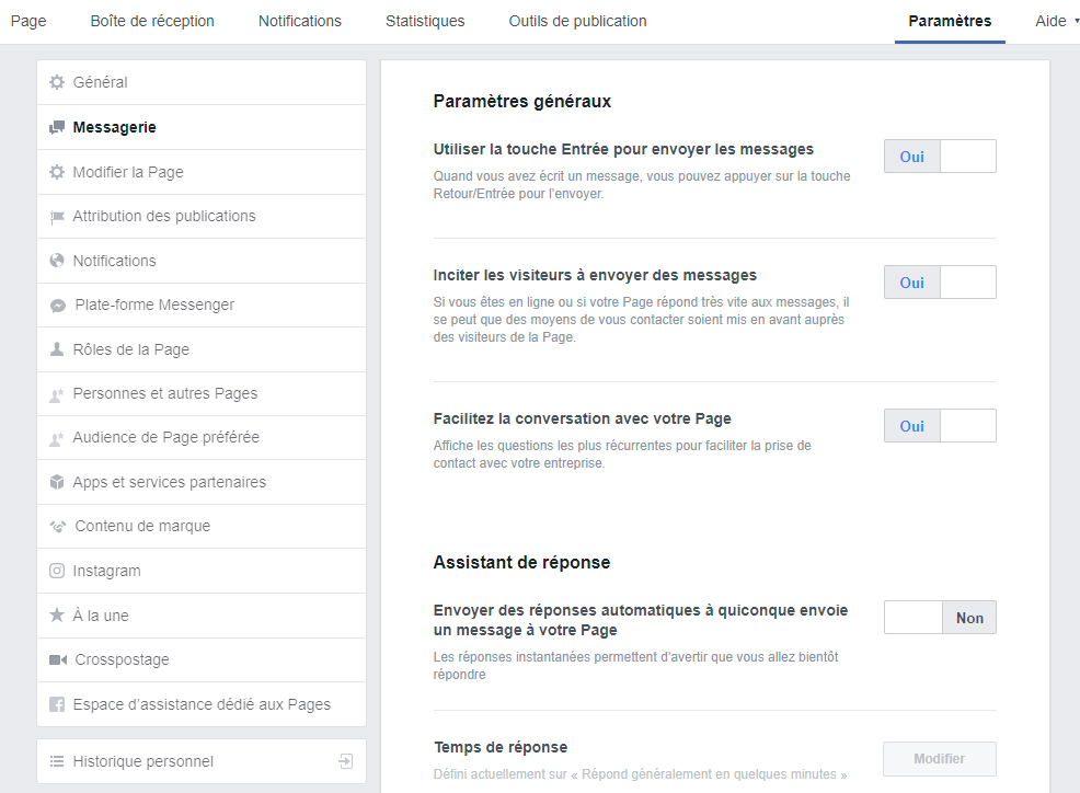 Pour configurer ces messages, accédez à votre page Facebook, Paramètres, Messagerie et mettez à jour la section Assistant de réponse.