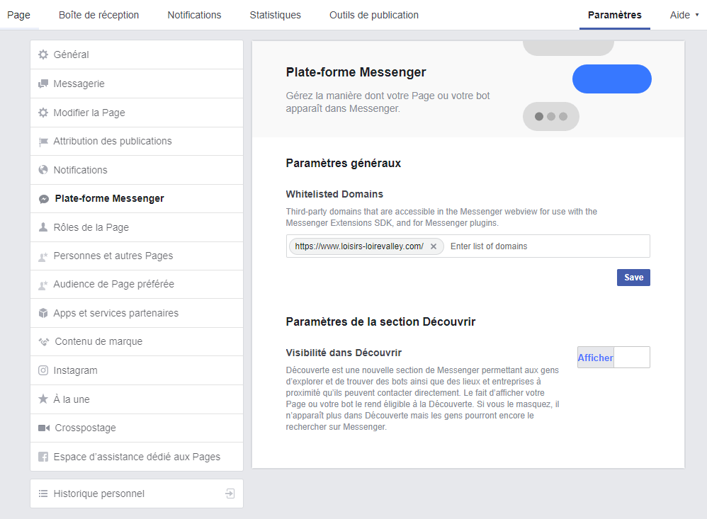 Étape 3 : Accédez à votre page Facebook, cliquez sur l’onglet « Paramètres », choisissez « Plate-forme Messenger », « Whitelisted Domains », entrez l’URL complète de votre site Web, puis cliquez sur « Enregistrer ».